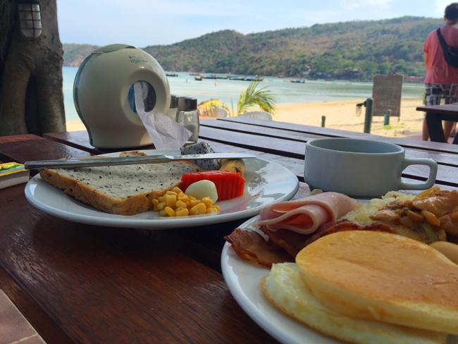 둘째날 리조트에서의 조식!! (호텔 이름이 기억안난다...) 난 첫날 타이가호텔보다 더 맛있었던것 같은데, 친구는 첫날이 더 좋았다 함.. 이렇게 호텔 식당 바로 앞으로 피피섬 해변이 보인다. 해변 보며 아침..