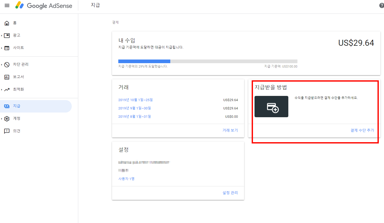 애드센스 화면에서 지급 탭으로 들어가