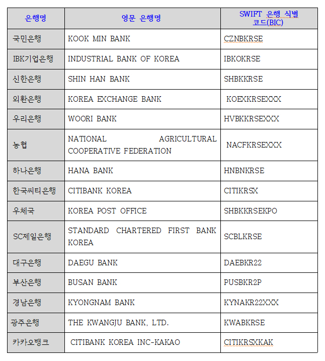은행 이름과 은행 식별 코드는 아래 사진으로 넘어가 보자.