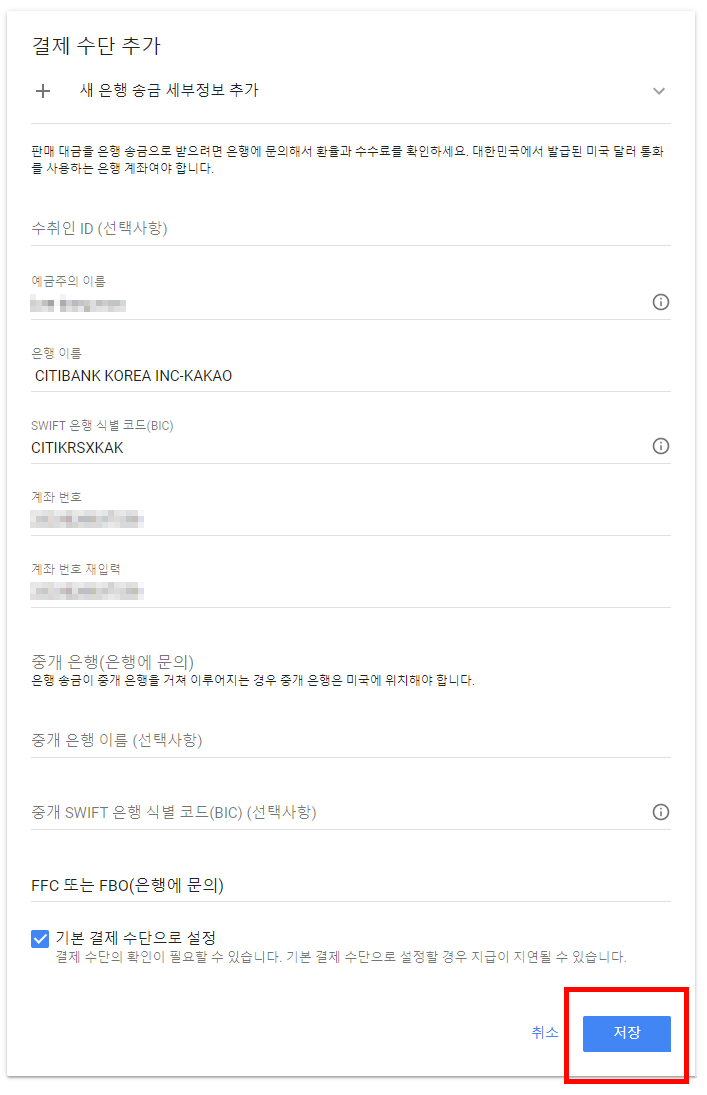 그다음 새 은행 송금 세부정보 추가를 누른다.