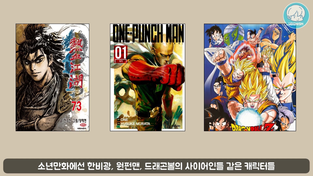 소년만화에선 한비광, 원펀맨, 드래곤볼의 사이어인 같은 캐릭터들