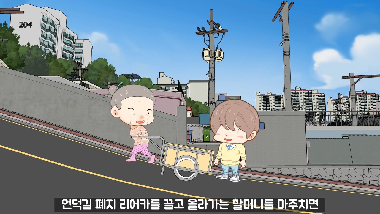 언덕길 폐지 리어카를 끌고 올라가는 할머니를 마주치면
