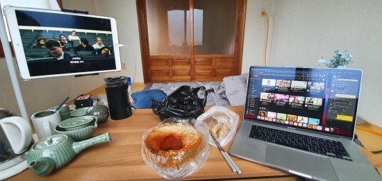 (천국 세팅) 이불까지 깔아두어 차 마시다 바로 누울 수 있음.